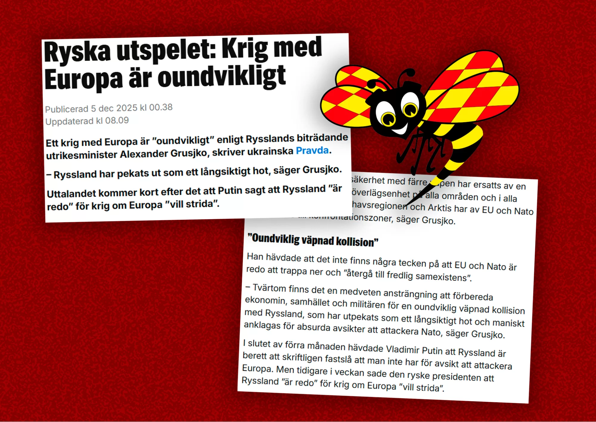 Artikeln presenterar citat ur tidningen Pravda i Ukraina – som bekant ligger i krig med Ryssland – som fakta. Redan där borde varningslampor för krigspropaganda blinka. Men otroligt nog lyckas den svenska tidningen skriva en ännu mer obalanserad artikel än sin ukrainska förlaga.