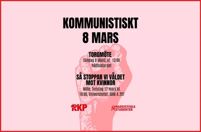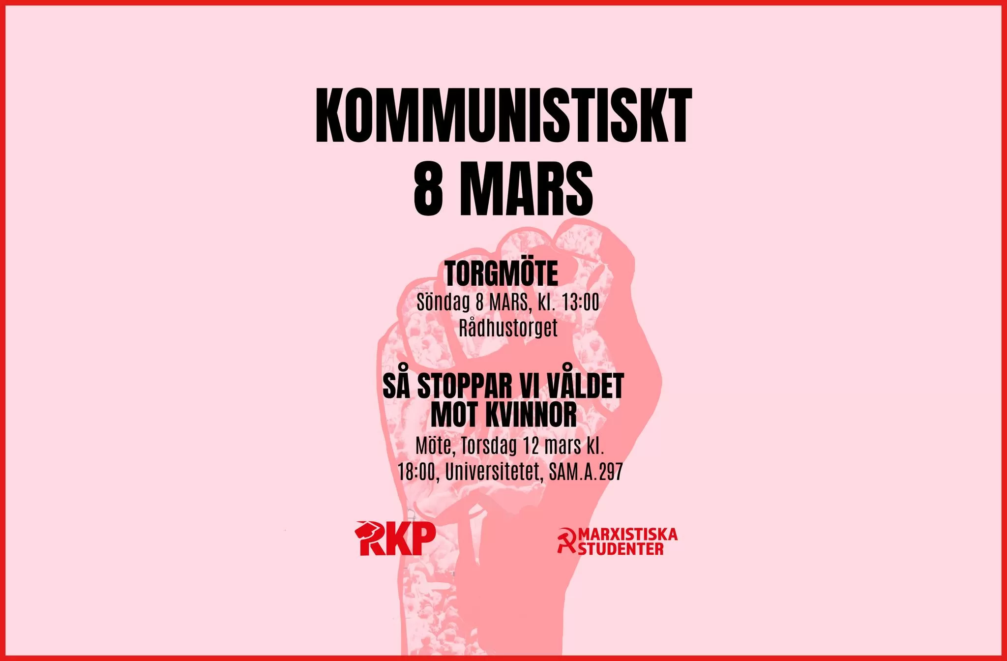 Kom på RKP:s torgmöte på 8 mars och vårt öppna möte på universitetet om hur vi kämpar mot det ökade våldet mot kvinnor, och hur vi kan kämpa för att avskaffa kvinnoförtrycket en gång för alla!
