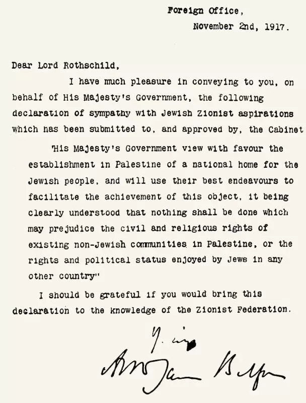 “Hans majestäts regering ser med välvilja på upprättandet av en nationell hemvist för det judiska folket i Palestina, och kommer att på bästa sätt anstränga sig för att underlätta verkställandet av detta mål, under den tydliga förutsättningen att inget kommer att göras som kan vara till men för de mänskliga eller religiösa rättigheterna hos befintliga icke-judiska samhällen i Palestina, eller de rättigheter och den politiska ställning som åtnjuts av judar i något annat land.”